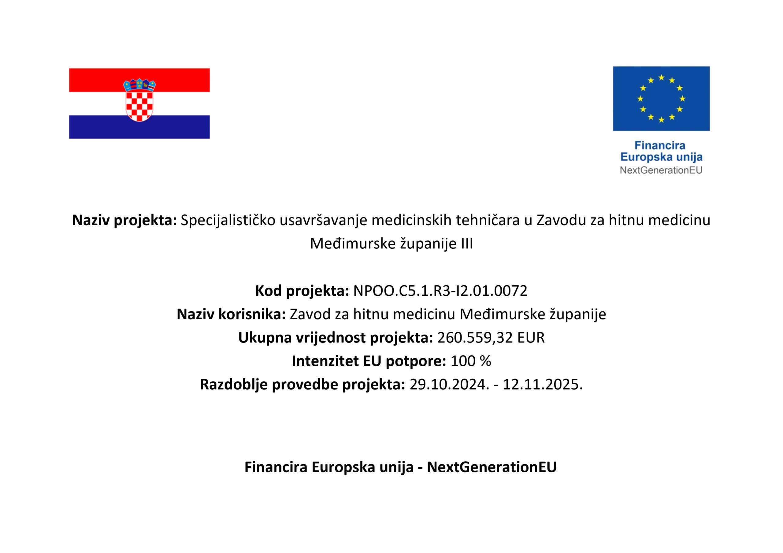 Vrijednost projekta „Specijalističko usavršavanje medicinskih tehničara u Zavodu za hitnu medicinu Međimurske županije III“ je 260.559,32 EUR i u potpunosti je financiran iz EU sredstava.